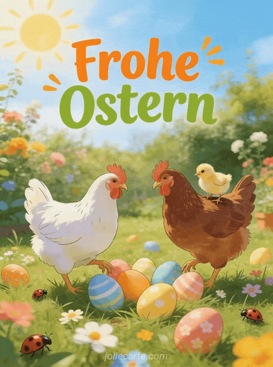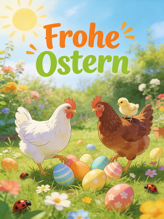 Teile diese fröhliche Hühner-Osterkarte und feiere den Frühling. Entdecke auch eine Osterhase Bild Karte oder eine frohe ostern süß Karte.