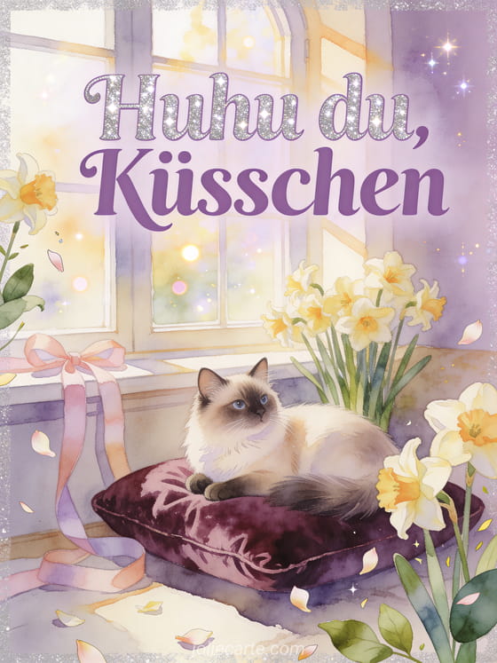 Teile einen weichen Gruß mit lilafarbener Aquarellschrift, einer Birma-Katze auf einem Samtkissen, Narzissenblüten, pastelligen Schleifen und einem sonnigen Erkerfenster. Entdecke auch ein Kätzchen Hallöchen, eine ein süßer kleiner Gruß Küsse Karte oder einen Gruß mit hallo guten Morgen Zeichnung.