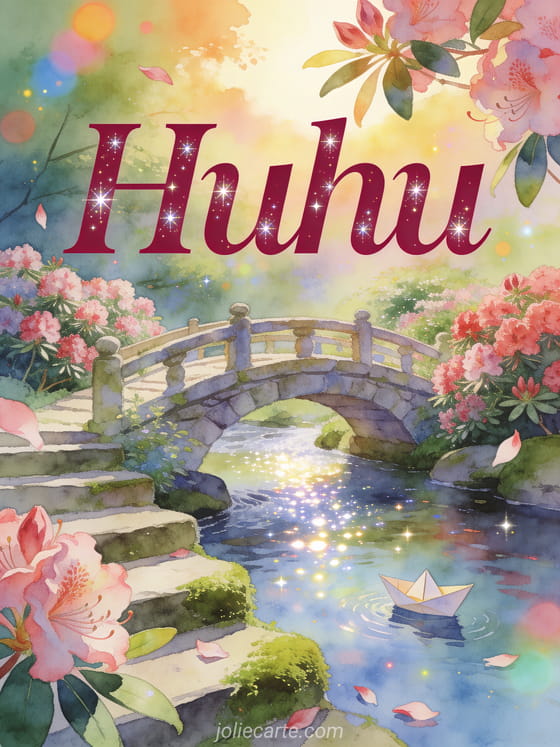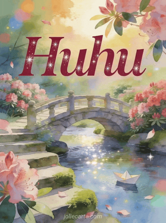 Verschicke eine Huhu-Karte mit einer Steinbrücke über einen funkelnden Bach, Rhododendren und einem kleinen Papierboot im warmen Nachmittagslicht. Entdecke auch ein hallo du GIF, ein hallo schönen Tag GIF oder Huhu Guten Morgen Bilder.