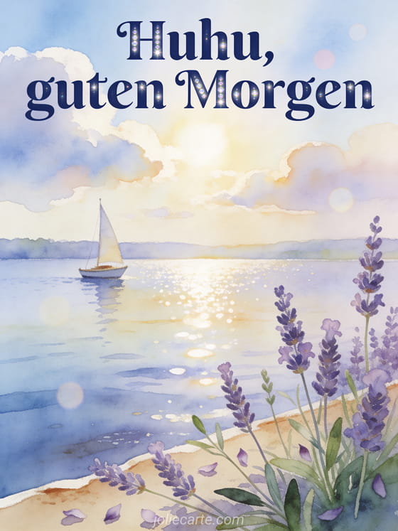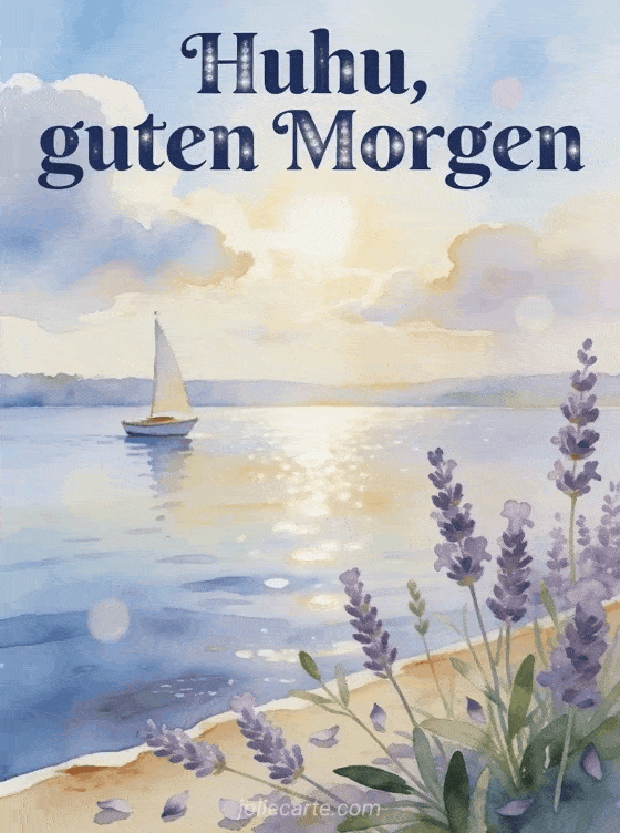 Beginne den Tag mit marineblauer Schrift, Lavendelstängeln über dem Rand und einem kleinen Segelboot auf einem hellen See unter gemalten Wolken. Dazu passen auch Hallo Huhu GIF, süßes Huhu Küsschen GIF oder schöner Tag Huhu Guten Morgen GIF.