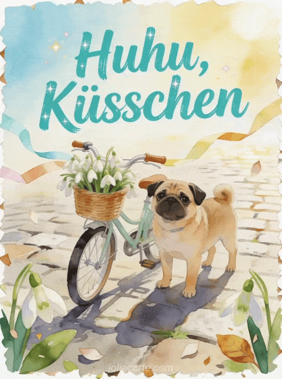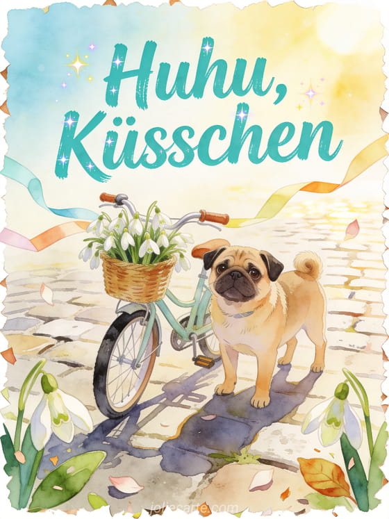 Teile eine helle Karte mit türkiser Schrift, einem Mops neben einem kleinen Fahrradkorb voller Schneeglöckchen, Papiergirlanden und sonnigem Kopfsteinpflaster. Dazu passen Huhu schöner Tag GIFs, schöne Bilder Huhu Guten Morgen oder Huhu Küsschen GIF.