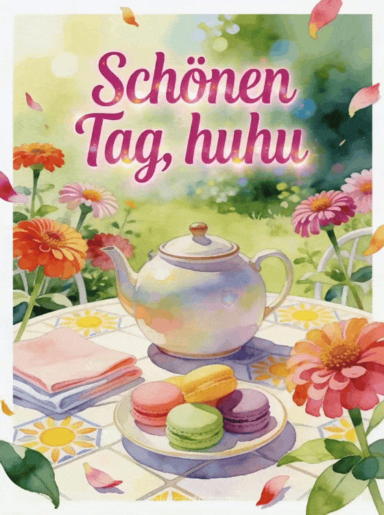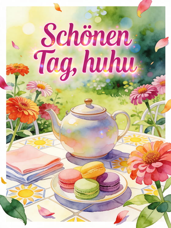 Teile eine freundliche Nachricht für einen schönen Tag mit fuchsiafarbener Schrift, einer runden Teekanne, Zinnien, bunten Macarons, gefalteten Servietten und sonnigen Mustern auf Fliesen. Entdecke auch eine schöne Bilder Huhu Guten Morgen Karte, eine Hallo gelb Karte oder eine viele Küsse ein kleiner freundlicher Gruß Karte.