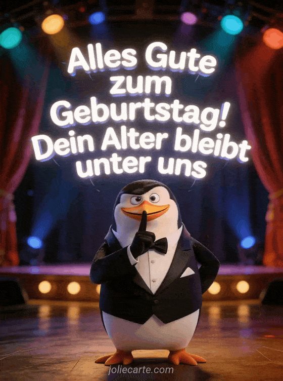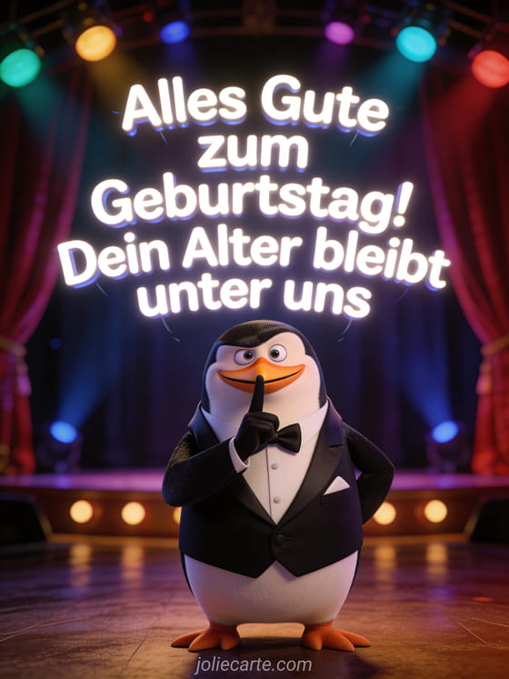 Teilen Sie ein Lachen mit dieser humorvollen Geburtstagskarte mit einem Pinguin im Smoking auf einer Cabaret-Bühne. Entdecken Sie auch geburtstagskarte humor mann, humor zitat geburtstag oder bilder geburtstag humor mann.