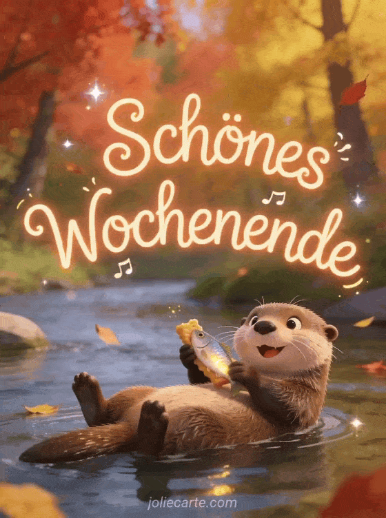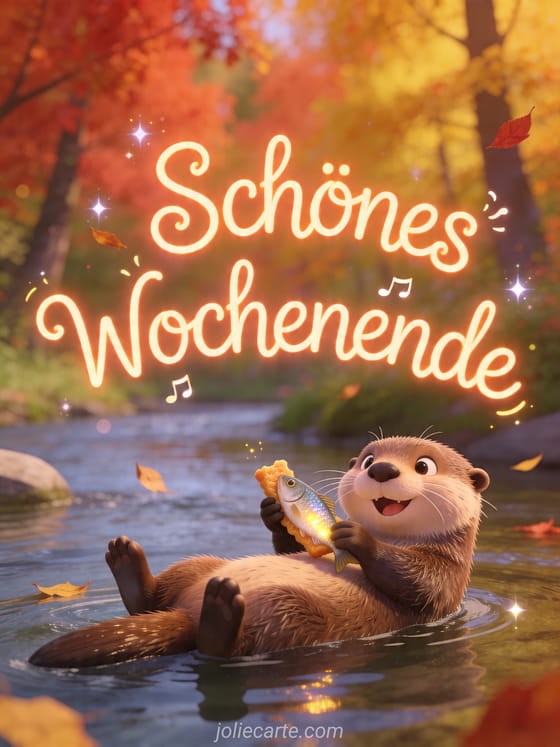 Teilen Sie diese lustige Karte Schönes Wochenende mit einem verspielten Otter im Fluss, einem Fisch und herbstlichen Bäumen. Entdecken Sie auch schönes wochenende mit humor wünschen, animiertes schönes wochenende gif und ein schönes wochenende.
