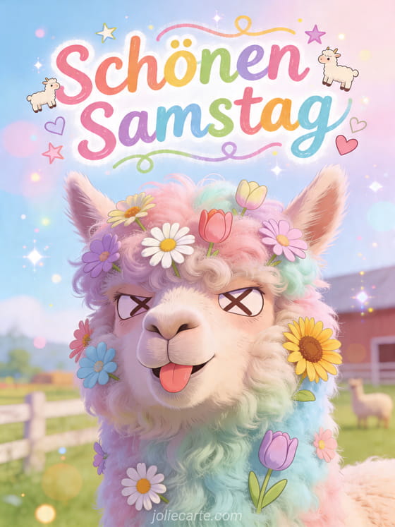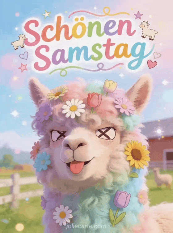 Teile mit dieser kostenlosen Karte einen lustigen Gruß für einen schönen Samstag mit einem flauschigen Alpaka, das eine alberne Grimasse zieht und Blumen im Fell trägt. Entdecke auch guten morgen und schönen samstag, schöner samstag humor gif oder schöner samstag animiertes gif.