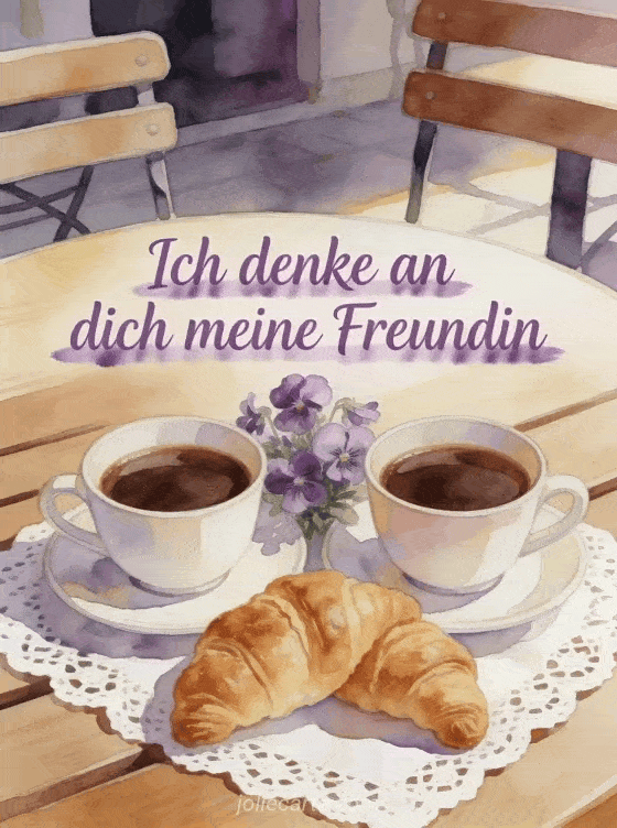 Sende ein fröhliches Ich-denke-an-dich-GIF an deine Freundin mit dieser wunderschönen kostenlosen Karte. Zwei Kaffeetassen nebeneinander auf einem Bistrotisch mit einem kleinen Veilchenstrauß, goldenen Croissants und warmem Morgenlicht, für eine herzliche Freundschaftsgrüße. Entdecke auch eine Karte ich denke an dich karten oder eine Karte animierte gifs ich denke an dich.