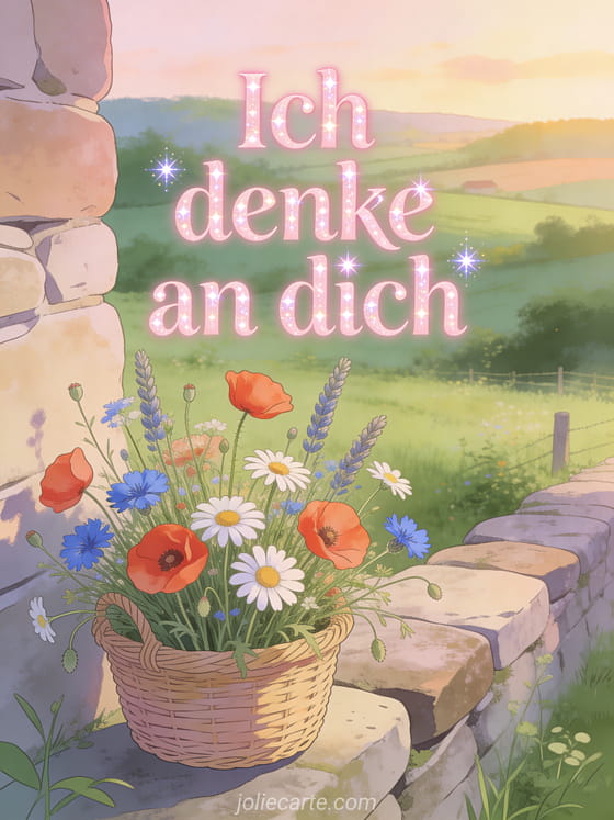 Schick diese charmante Karte ich denke an dich meine Freundin mit einem Wildblumenkorb auf dem Land. Entdecke auch ich denke an dich mit einer Rose oder Schmuck ich denke an dich.