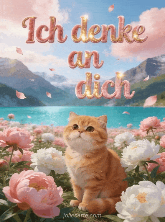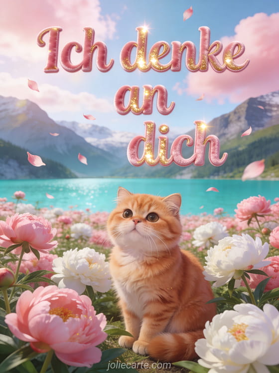 Ich denke an dich mit einer Rose eine zärtliche und bunte Karte mit einer charmanten Katze und Pfingstrosen