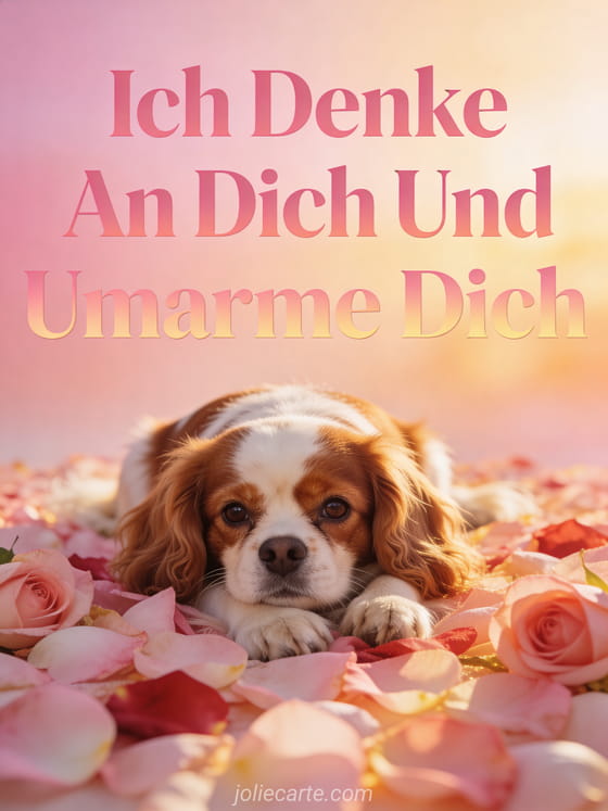 Senden Sie diese liebevolle Grußkarte mit einem süßen Cavalier King Charles Hund auf einem Bett aus Rosenblättern. Entdecken Sie auch eine Karte ich denke an dich und träume von dir oder eine Karte ich denke so sehr an dich mein Schatz.