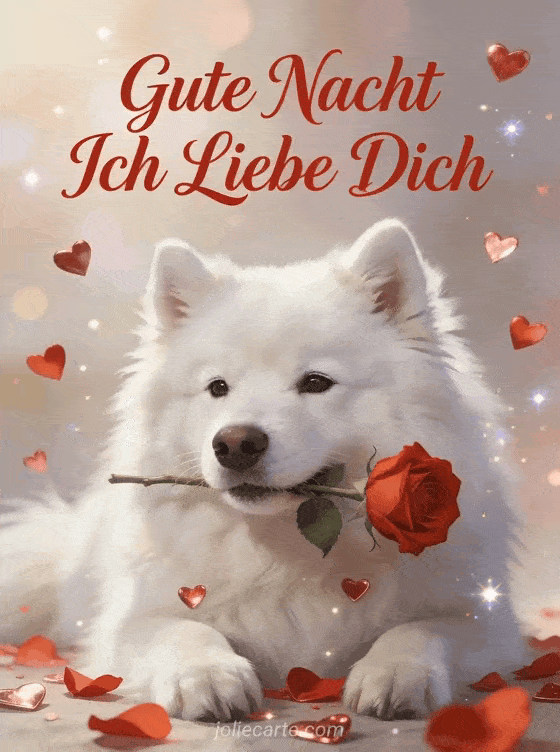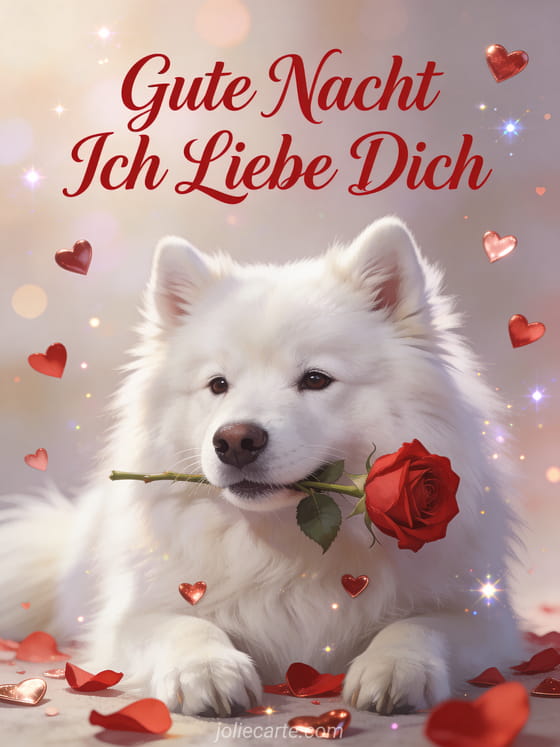 Versende diese romantische Gute-Nacht-Karte mit einem flauschigen weißen Samojeden-Hund mit liebevollem Blick der eine rote Rose im Maul hält in einer verträumten Atmosphäre mit funkelnden Lichtpartikeln. Eine süße Art deinem Schatz Gute Nacht zu sagen. Entdecke auch eine animierte Gute-Nacht-Karte für Liebende oder eine romantische Gute-Nacht-Karte.
