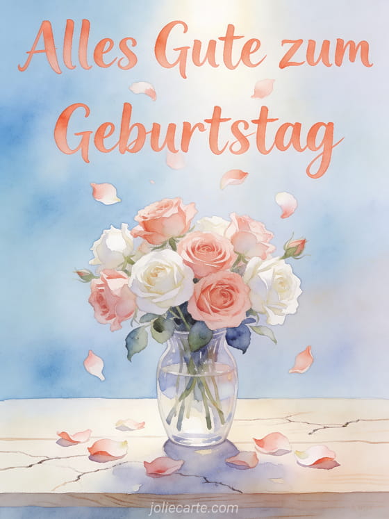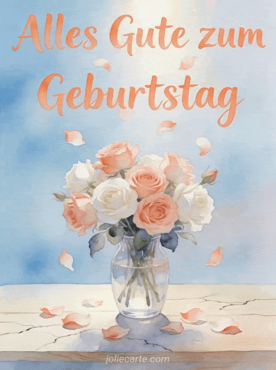 Senden Sie diese elegante animierte JolieCarte Geburtstagskarte mit rosa und weißen englischen Rosen in einer Glasvase, verstreute Blütenblätter auf einem hellen Holztisch. Entdecken Sie auch das animierte Bild Herzlichen Glückwunsch oder die Geburtstagskarte animiertes GIF kostenlos.