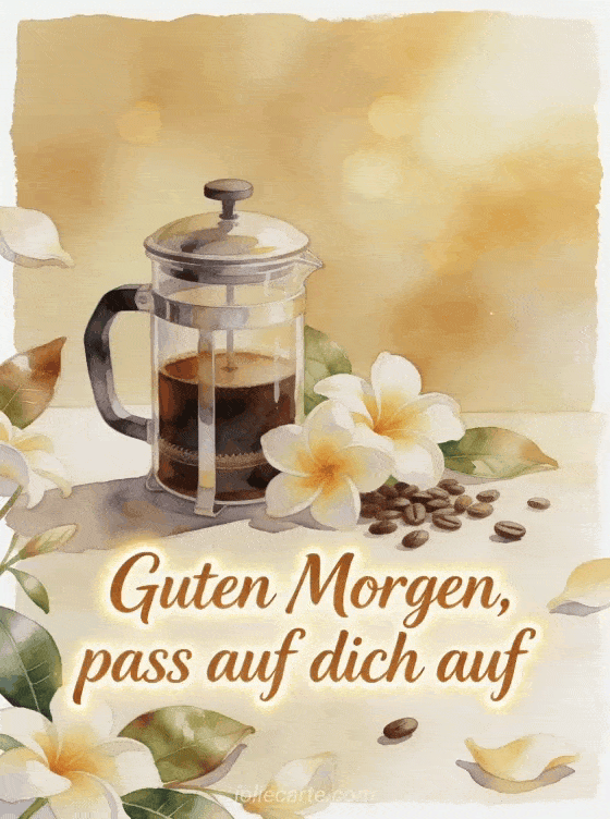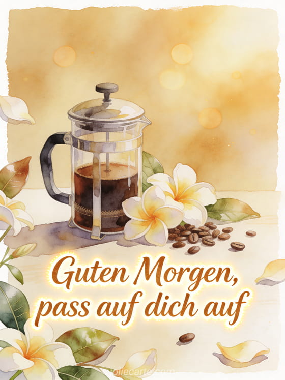 Schenke einen ruhigen Morgengedanken mit dieser Aquarellkarte, mit einer French Press aus Glas, kräftigem Kaffee, Frangipani-Blüten, glänzenden Blättern und Bohnen. Entdecke auch Guten Morgen Kaffee GIF, schönes Guten Morgen Kaffee Bild oder Guten Morgen guter Kaffee am Morgen.