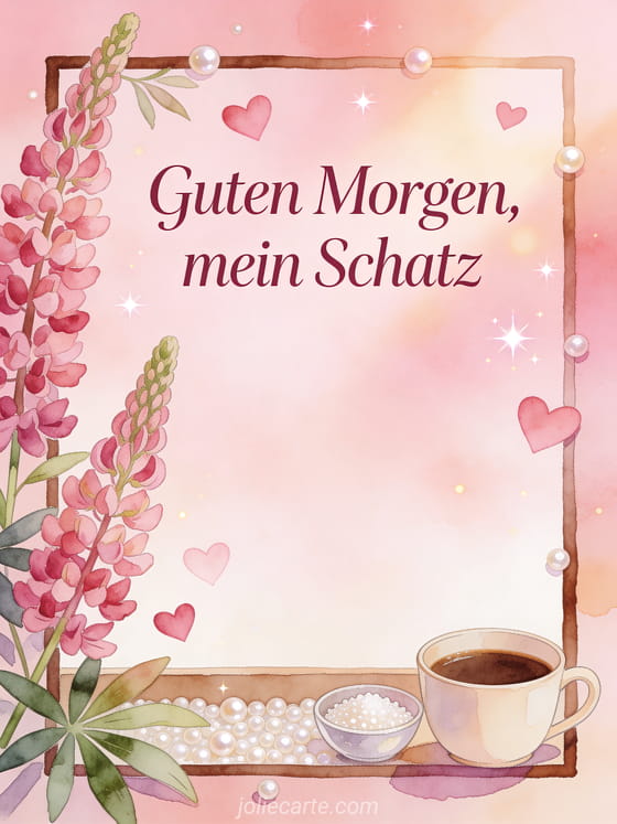 Teile einen liebevollen Morgengedanken mit dieser Aquarellkarte, mit einer Kaffeetasse, einer kleinen Schale Perlzucker, Lupinenblüten und zarten Herzformen in sanftem Licht. Entdecke auch kostenloses Guten Morgen Kaffee Bild, Morgenkaffee Guten Morgen oder Kaffee Guten Morgen Kaffee animiertes GIF.