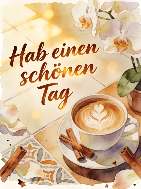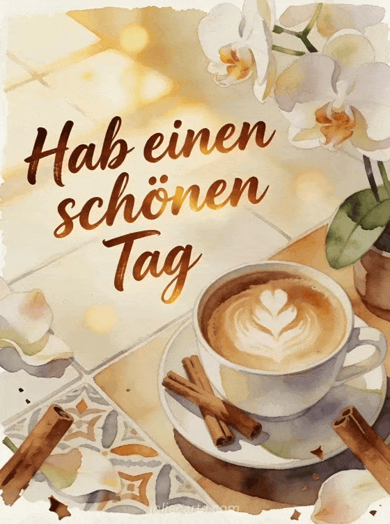 Wünsche einen schönen Tag mit einer gemütlichen Kaffeeecke, Cappuccino, Zimtstangen, Orchideen und warmem Aquarelllicht. Entdecke auch schönen Tag Kätzchen GIF, schönen Tag guten Morgen Strand Bild oder Schönen Tag Sonne Gifs.