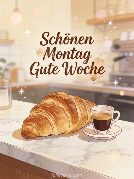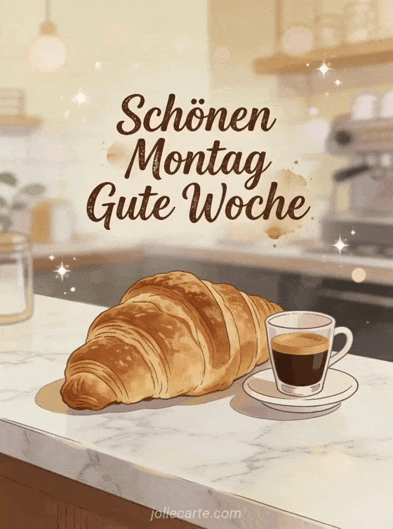 Starte jemandem die Woche mit einem Pariser Frühstück mit Croissant und Espresso. Entdecke auch eine Karte gute Woche guten Montag Bild, eine Karte Humor Mut guten Montag oder eine Karte schönen montag dicke küsse.