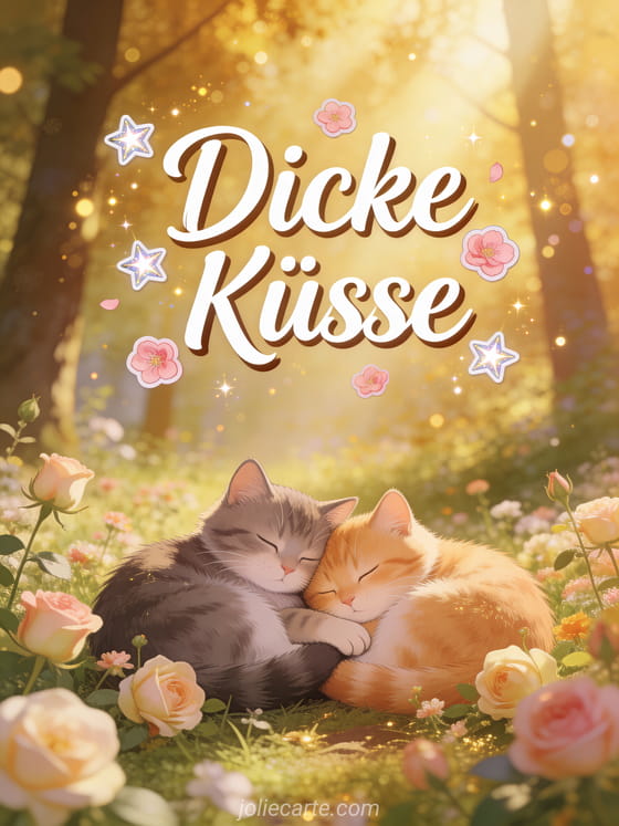 Teile die Liebe mit dieser zauberhaften Karte mit dicken Küssen und zwei Katzen, die in einer blumenreichen Lichtung schmusen. Entdecke auch zarte küsschen animiert oder Küsse Clipart kostenlos.