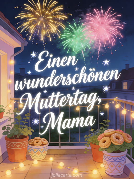Feiere mit dieser farbenfrohen Karte für den Muttertag. Ein Dachgarten bei Nacht mit spektakulärem Feuerwerk, das den Himmel in Gold, Grün und Pink erstrahlen lässt, schöne Nelken in Dekorationstöpfen und warmes Lichterkettenlicht. Entdecke auch eine kostenlose Muttertagskarte Grüße oder eine Muttertagskarte kostenlos herunterladen.