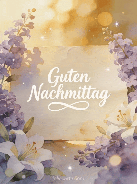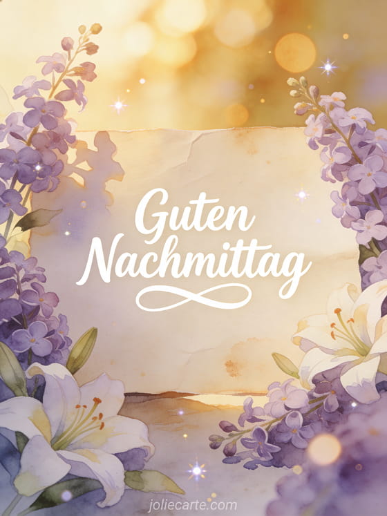 Teile Eleganz mit dieser Guten-Nachmittag-Karte mit einem wunderschönen floralen Aquarellrand aus Flieder und Lilien auf Vintage-Papier. Entdecke auch eine Karte von ihnen einen guten nachmittag wünschend oder gif guten nachmittag sonnig.
