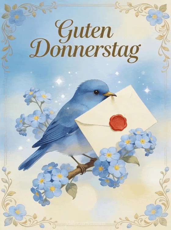 Schicke eine entzückende Donnerstag-Karte mit dieser eleganten Vintage-Szene, in der ein Blauvogel einen gesiegelten Brief zwischen Vergissmeinnicht trägt. Entdecke auch guten Morgen guter Donnerstag Küsse oder schöner Donnerstag große Küsse.