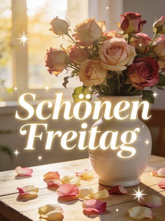Sende einen zarten schönen Freitag mit einem Strauß alter Rosen in einer weißen Keramikvase, sanftem Morgenlicht und feinen funkelnden Details. Entdecke auch lustiges Schönen Freitag Humor gif, Schönen Freitag Küsse animierte GIFs oder einen Freitag Guten Morgen Spruch.