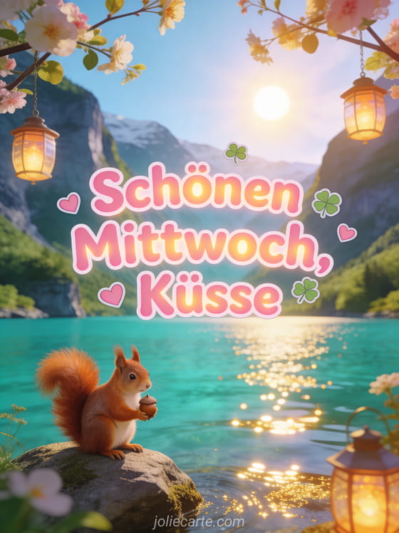 Sende Küsse zum schönen Mittwoch mit einem türkisfarbenen Fjord, grünen Bergen, leuchtenden Laternen und einem roten Eichhörnchen mit einer Haselnuss. Entdecke auch einen Text um einen schönen Mittwoch zu wünschen, Schönen Mittwoch mit Tieren oder Schönen Tag Guten Morgen schönen Mittwochstag.