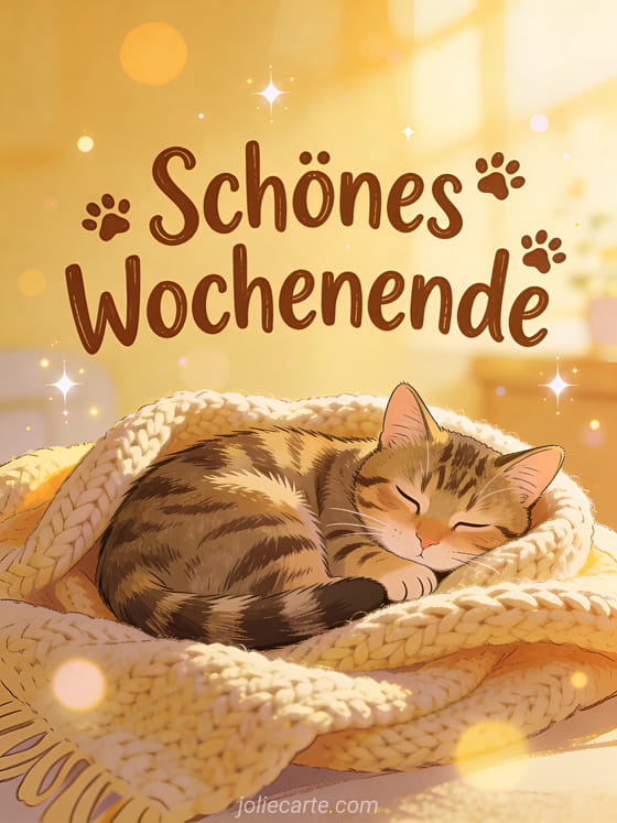 Sende eine Schönes-Wochenende-Karte mit Katze und teile etwas Gemütlichkeit. Eine schlafende Tigerkatze in einer weichen Strickdecke im warmen Nachmittagssonnenschein ist der perfekte Erholungswunsch. Entdecke auch eine Karte schönes wochenende oder gutes wochenende oder schöne bilder schönes wochenende humor.