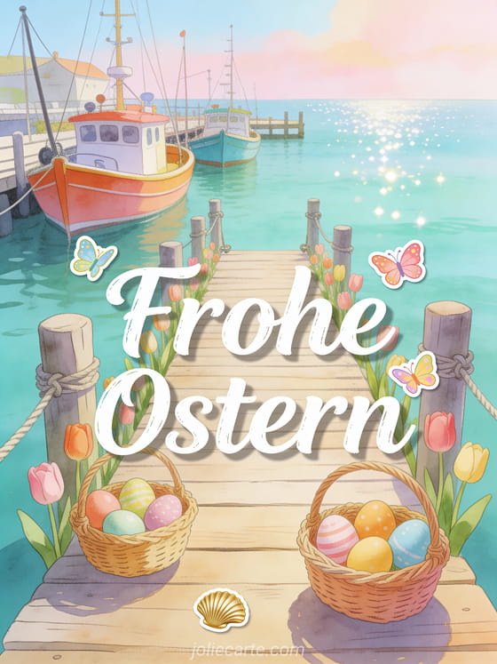 Senden Sie diese schoenen Karten fuer Ostern mit einem bezaubernden kleinen Fischerhafen mit bunten Booten, Osterkoerben voller bemalter Eier auf dem Holzsteg und fruehlingshaften Tulpen. Eine heitere und froehliche Szene. Entdecken Sie auch eine kostenlose frohe Osterkarte, eine Osterkarte oder eine Oster-Grusskarte.