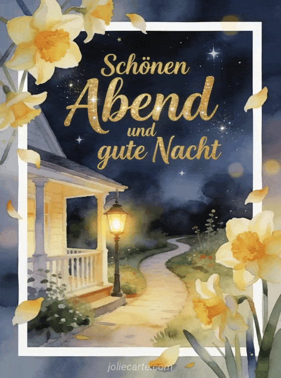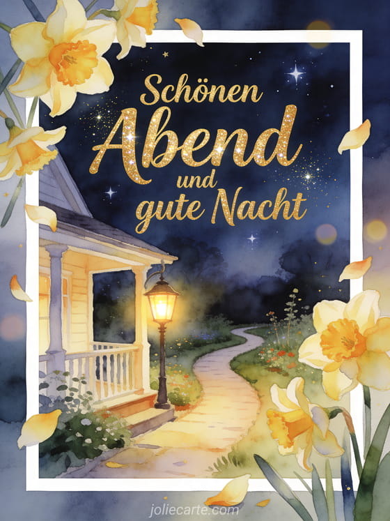 Teile schönen Abend und gute Nacht mit einer Aquarellkarte, die einen Gartenweg, eine leuchtende Verandalaterne, Narzissen und die ersten Sterne zeigt. Entdecke auch eine Karte mit Gute Nacht Wünsche, kostenlose animierte virtuelle Gute-Nacht-Karten oder wunderschöne Gute Nacht Nachricht.