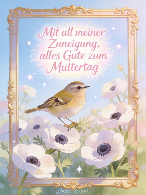 Teile eine sanfte Muttertagskarte im Bilderbuchstil, mit rosafarbenem Lettering, einer Grasmücke zwischen frischen Anemonen, einem verzierten Goldrahmen und klarem Morgenlicht. Entdecke auch Alles Gute zum Muttertag für meine Mama, ein kurzes Gedicht zum Muttertag oder Muttertagsfotos.