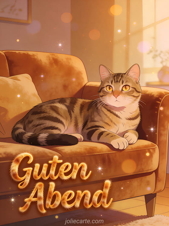 Sende einen gemütlichen Katze-Guten-Abend mit dieser eleganten kostenlosen Karte. Eine elegante Tigerkatze mit leuchtenden Augen, die auf einem Samtsofa liegt, mit einer heimelig gemütlichen Atmosphäre in warmen Bernstein- und Brauntönen, perfekt für einen gemütlichen Abendgruß. Entdecke auch eine Karte Schönen Abend am Kamin oder eine Karte Schönen Abend lustig Dankeschön.