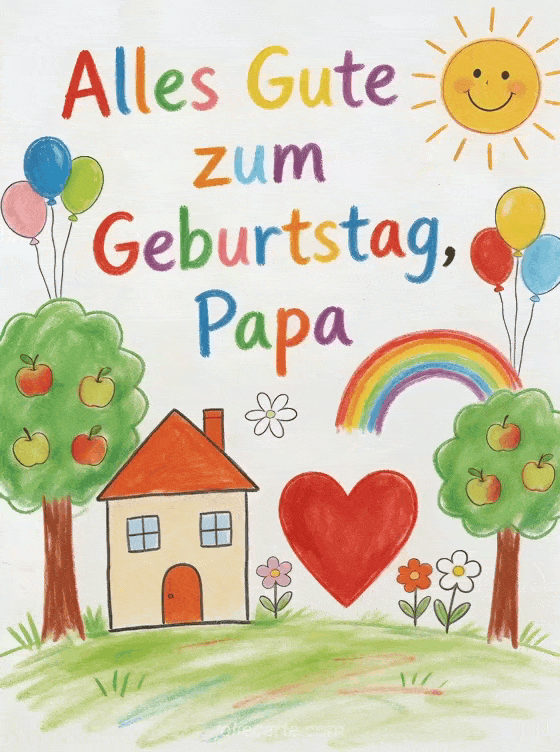 Teile eine Kinderzeichnung Geburtstag Papa Karte mit bunten Buntstiftbuchstaben, einem kleinen Haus, lächelnder Sonne, Apfelbäumen, Regenbogen, Blumen, Ballons und einem großen roten Herz. Entdecke auch ein Alles Gute zum Geburtstag Papa Bild, eine deine Tochter alles Gute zum Geburtstag Papa oder eine alles Gute zum Geburtstag Papa ich liebe dich.