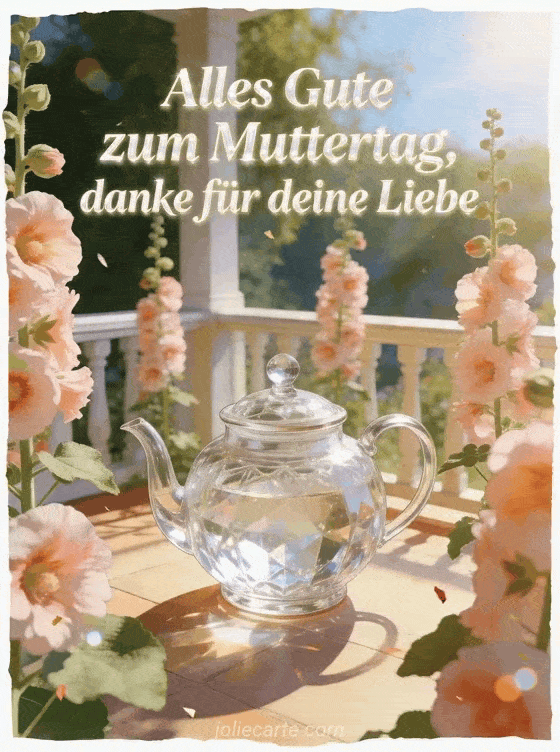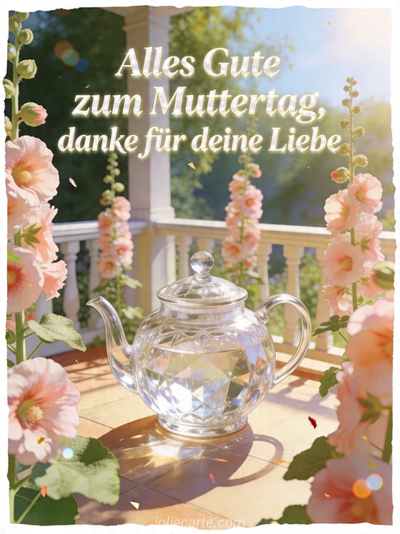 Danke Mama für ihre Liebe mit einer hellen Karte, die eine Kristallteekanne zwischen hohen Stockrosen auf einer sonnigen Veranda zeigt. Dazu passen Muttertagsfest, wie man seiner Mama alles Gute zum Muttertag wünscht oder Muttertag Foto.