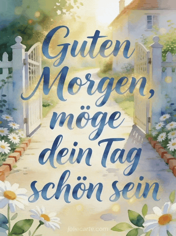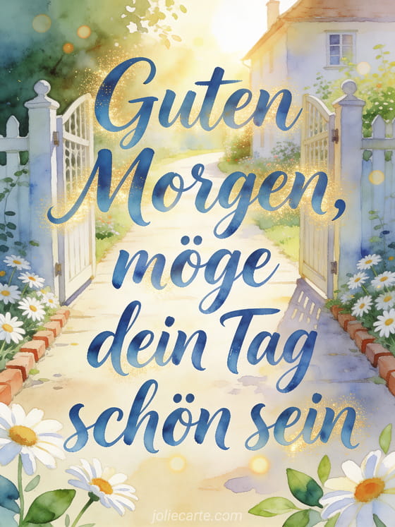 Sende eine herzliche kleine Nachricht zum Guten Morgen mit fließender blauer Aquarellschrift, einem sonnigen Gartentor, einem hellen Weg zum Cottage und frischen Margeriten. Entdecke auch Guten Morgen Nachricht an ihren Liebsten, virtuelle Guten-Morgen-Karte oder Guten Morgen Nachricht für meinen Mann.
