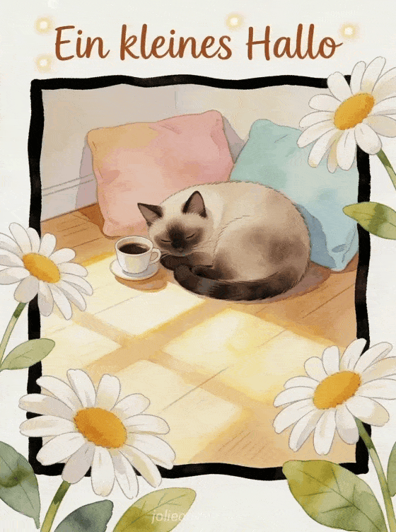 Teile ein süßes kleines Hallo mit warmbrauner Schrift, Margeritenblättern, einer Siamkatze, einer kleinen Espressotasse und sanftem Morgenlicht. Entdecke auch Kaffee Guten Morgen mit Sonnenaufgang, Guten Morgen mein Schatz Kaffee oder Morgen Kaffee Kaffee Morgen Guten Morgen.