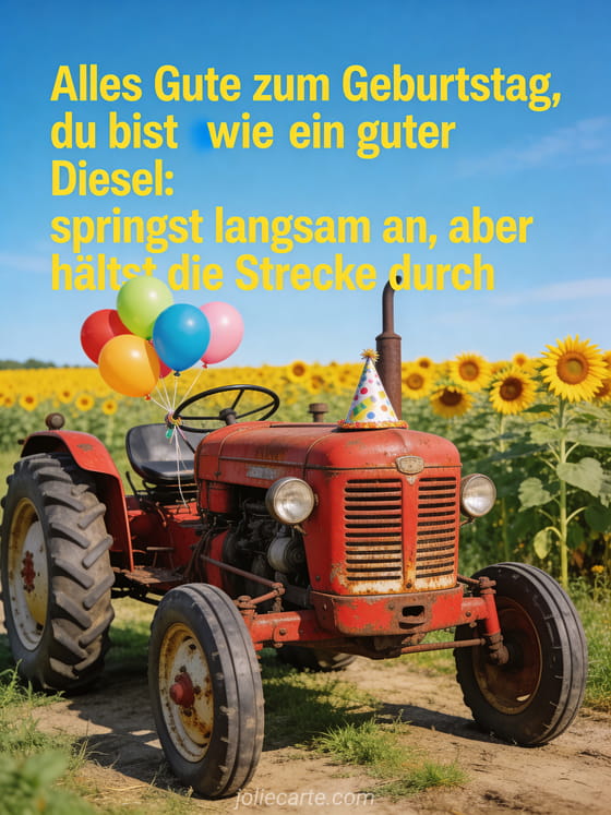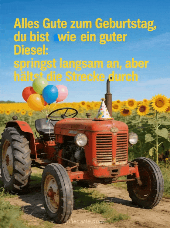 Teile diese witzige Geburtstagskarte mit einem liebenswerten alten Traktor, bunten Ballons und einem Spruch uber das Alter. Entdecke auch gif geburtstag mann humor kostenlos, alles gute zum geburtstag mann humor gif und schöne Geburtstagskarte Mann.