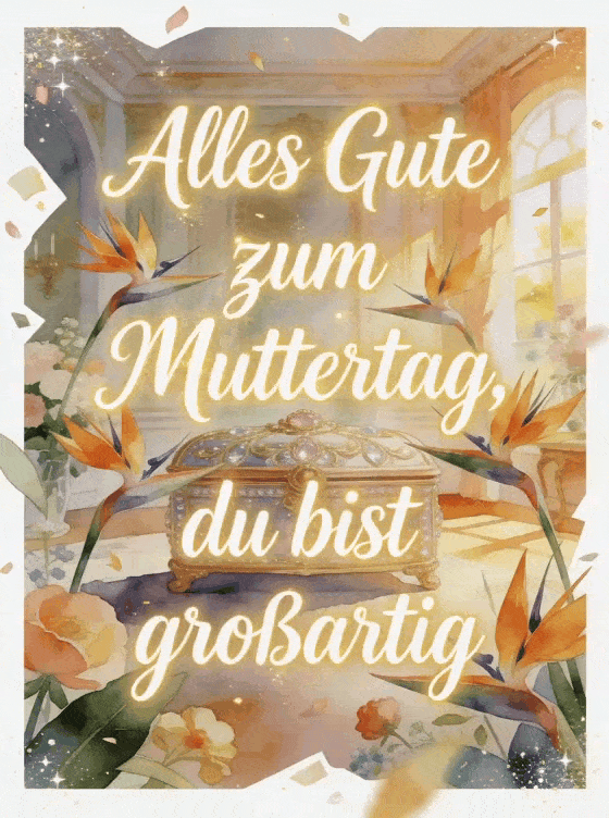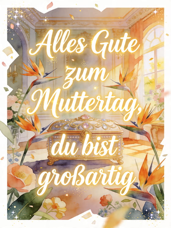 Sende ein Kompliment zum Muttertag mit leuchtender Kalligrafie, warmen Aquarellfarben und Paradiesvogelblumen rund um ein verziertes Schmuckkästchen in einem sonnigen Frühlingssalon. Diese bewundernde Karte sagt du bist großartig mit Eleganz und Zuneigung. Entdecke auch wie du deiner Mama alles Gute zum Muttertag wünschst, Alles Gute zum Muttertag für eine verstorbene Mama oder Muttertagskarte.