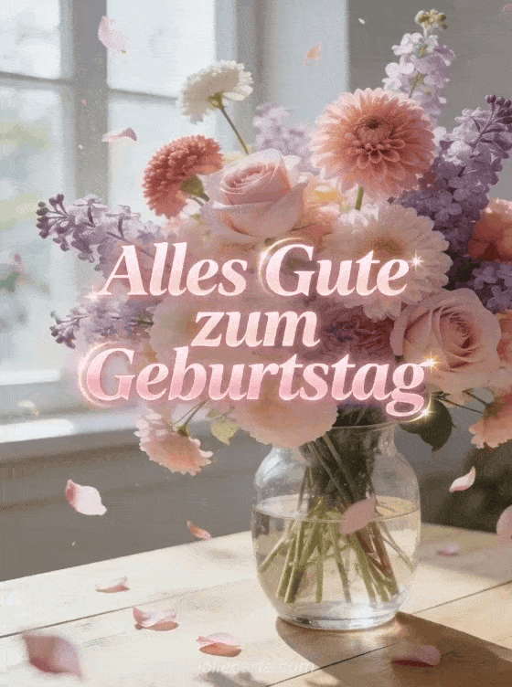 Verschicke mit dieser üppigen Blumenkarte einen strahlenden Geburtstagsgruß mit Rosen, Dahlien, Ranunkeln und Flieder. Entdecke auch eine dromedar geburtstagskarte animiert kostenlos musikalisch per sms, eine Geburtstagskerze animiertes GIF oder ein alles gute zum geburtstag animiertes gif.