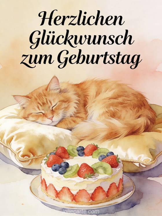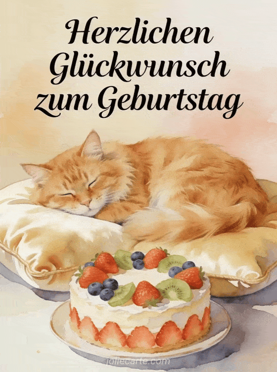Sende diese charmante kostenlose animierte Geburtstagskarte mit einer schlafenden roten Katze auf einem Samtkissen und einem mit Früchten verzierten Kuchen. Entdecke auch ein Geburtstag GIF Feuerwerk animiert oder ein Alles Gute zum Geburtstag animiertes GIF.