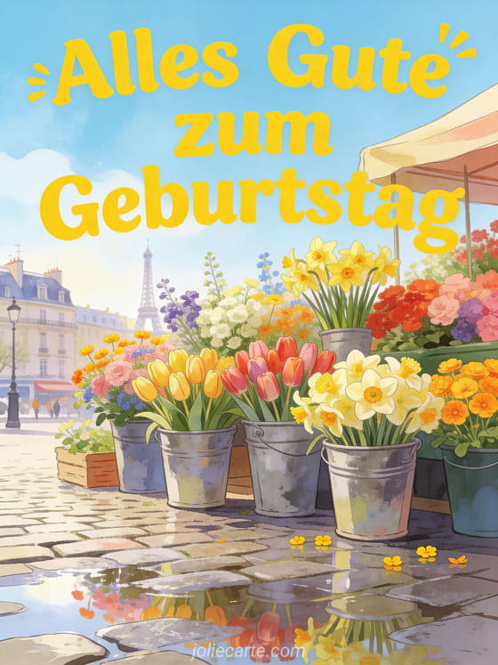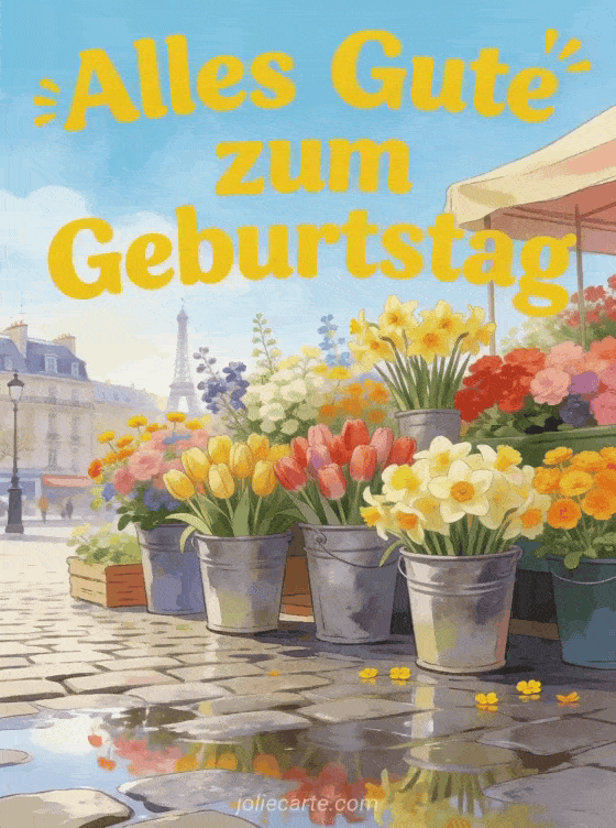 Feiere mit einer kostenlosen animierten Geburtstagskarte im Stil eines bunten Frühlingsblumenmarkts voller Tulpen, Narzissen und Ranunkeln. Entdecke auch dromadaire animierte Geburtstagskarten, animiert alles Gute zum Geburtstag Katze und animiertes GIF alles Gute zum Geburtstag Katze GIF.