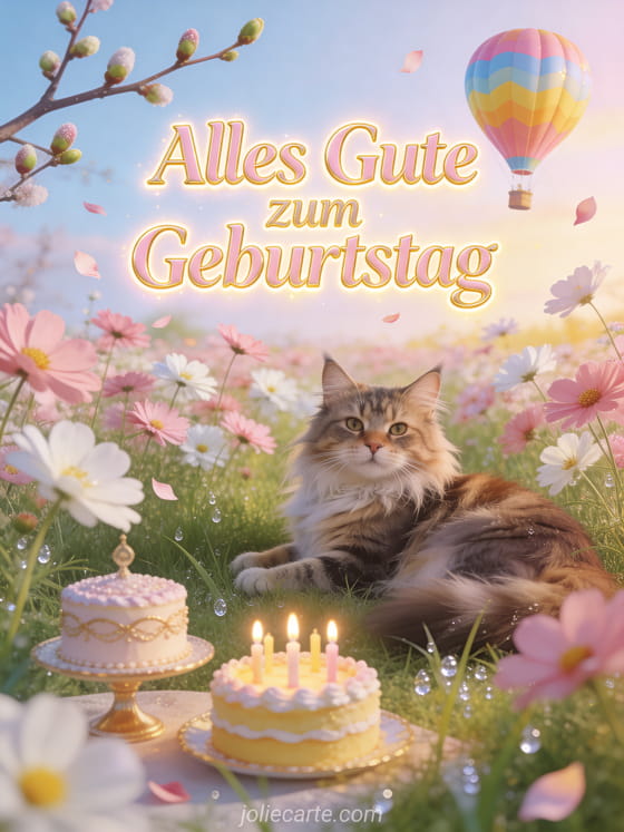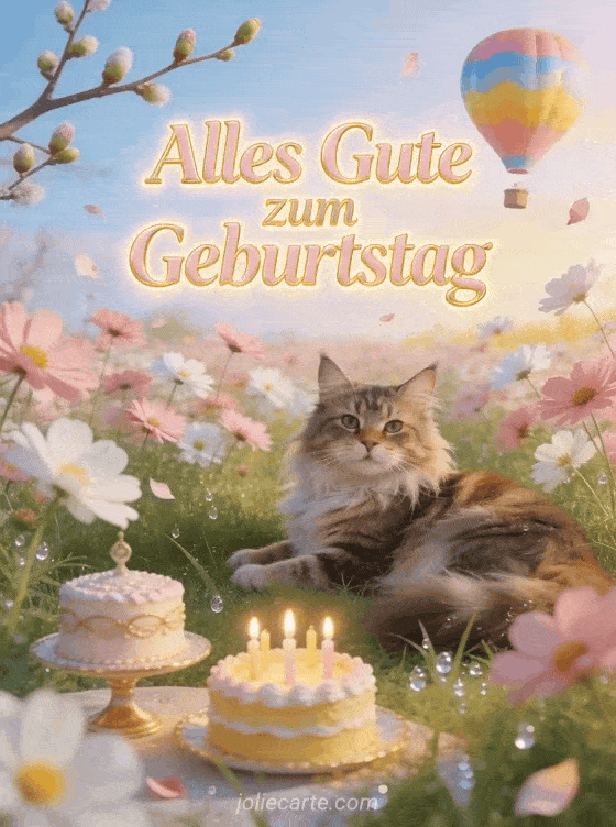 Verschicke eine wunderschöne animierte Geburtstagskarte mit einer Maine Coon Katze auf einer frühlingshaften Cosmos-Blumenwiese, einem bunten Heißluftballon und einem Geburtstagskuchen mit brennenden Kerzen. Entdecke auch eine hübsche animierte Geburtstagskarte oder eine kostenlose animierte Geburtstagskarte.