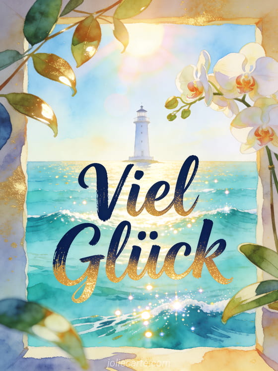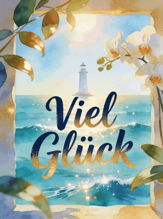 Wünsche viel Glück mit einem weißen Leuchtturm über hellem türkisfarbenem Meer, Orchideen am Rand, sonnigen Wellen und funkelnden Lichtpunkten. Entdecke auch Nachricht um viel Glück für eine Prüfung zu wünschen, Viel-Glück-Nachricht für einen neuen Job oder viel Glück animiertes GIF.