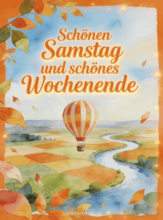 Teile einen fröhlichen Gruß zu Samstag und Wochenende mit orangefarbener Schrift, einem gestreiften Heißluftballon, Feldern wie ein Mosaik, einem gewundenen Fluss und weitem Himmel. Entdecke auch ein Schönen Samstag und Wochenende Bild, schönen Samstag Blumen Bilder oder Schönen Samstag Glitzerbilder.