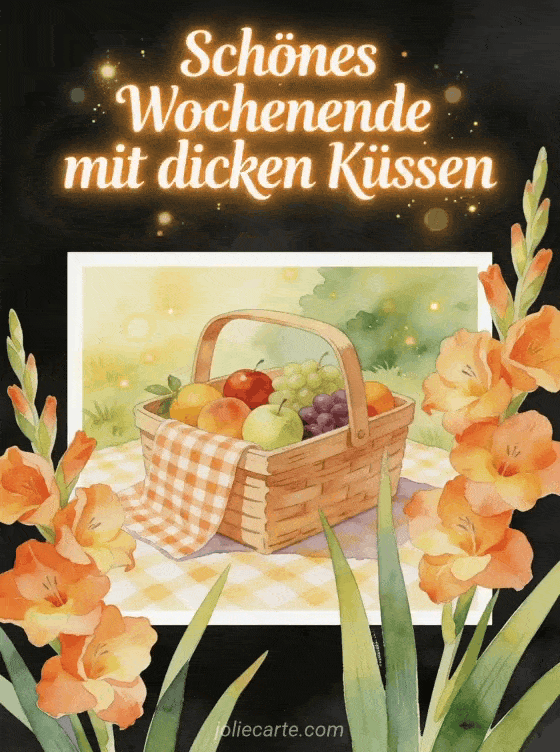 Teile Wochenendküsse mit einer Aquarellkarte voller Gladiolen, einem Marktkorb mit Früchten und einer fröhlichen Picknickdecke in goldenem Licht. Du kannst auch schönes Wochenende Küsse gifs senden, hab ein schönes Wochenende Küsse teilen oder Zärtlichkeit schönes Wochenende Küsschen wählen.