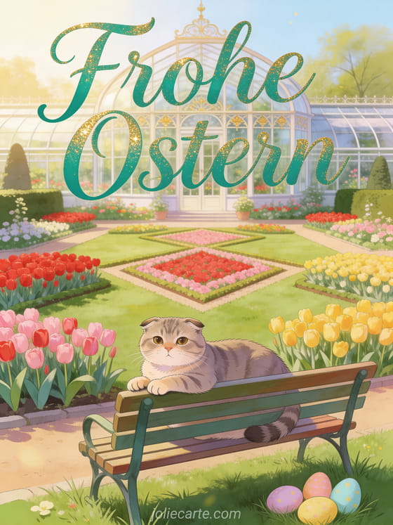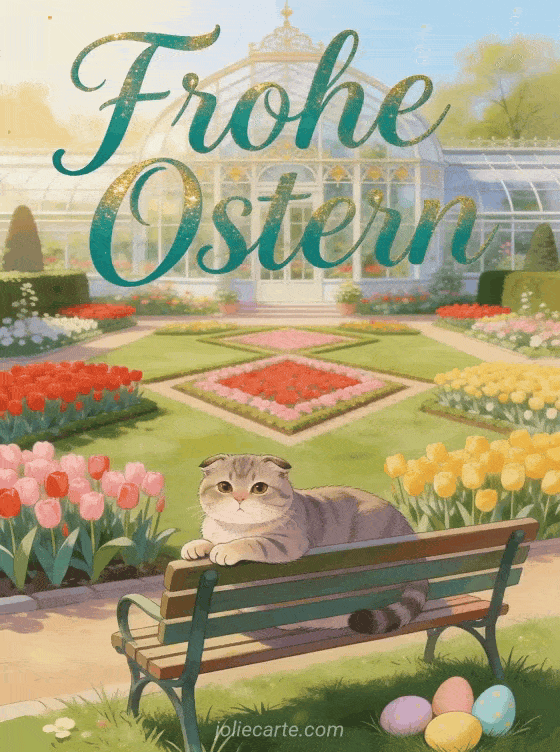 Feiern Sie Ostern mit dieser bezaubernden kostenlosen animierten Grußkarte mit eine Scottish-Fold-Katze auf einer Gartenbank mit Blick auf geometrische Tulpenbeete in Keukenhof mit einem viktorianischen Gewächshaus und pastellfarbenen Ostereiern. Entdecken Sie auch carte gratuite de pâques cartes de joyeuses fetes de paques.