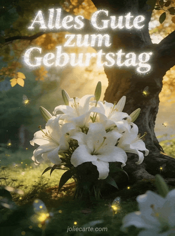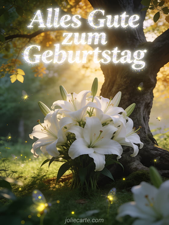 Senden Sie diese mystische kostenlose Geburtstagskarte für Männer mit einem majestätischen Strauß weißer Lilien, goldenem Abendlicht und leuchtenden Glühwürmchen in einem verzauberten Waldlichtung. Entdecken Sie auch eine Geburtstagskarte Gärtner Mann oder ein Geburtstag Foto Mann.