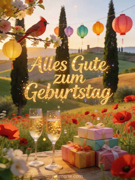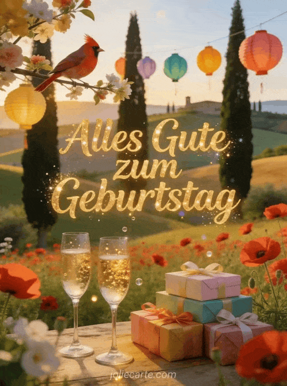 Teile eine festliche Geburtstagskarte mit sanften toskanischen Hügeln, roten Mohnblumen, hohen Zypressen, bunten Lampions, einem Gimpel, Champagnergläsern und Geschenken. Entdecke auch eine alles Gute zum Geburtstag Sohn Karte, ein alles Gute zum Geburtstag mein Sohn animiertes gif oder eine Geburtstagskarte für meinen Sohn.