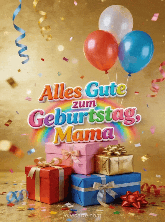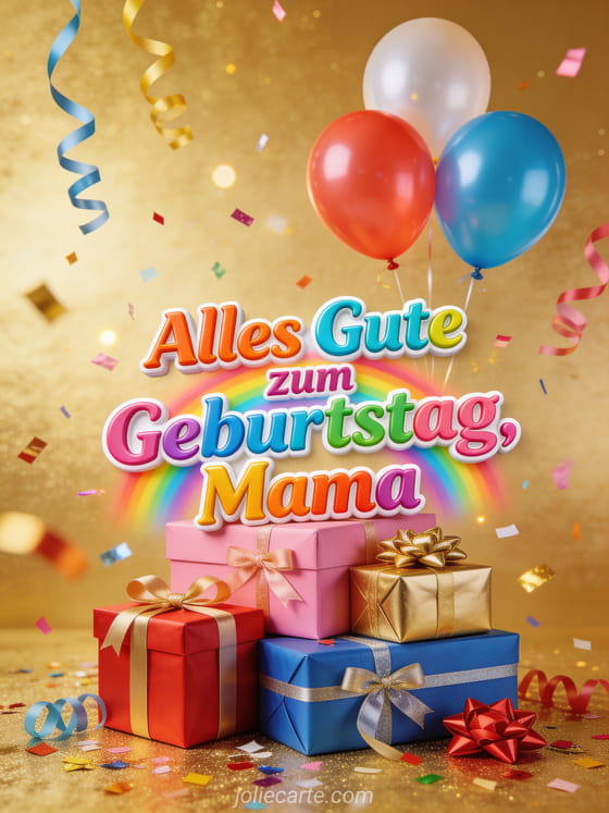 Feiere Mama mit einer farbenfrohen Geburtstagskarte voller Regenbogentext, gestapelter Geschenke, Bänder, Schleifen, Konfetti, Luftschlangen, Ballons und leuchtender goldener Stimmung. Du kannst auch eine alles Gute zum Geburtstag meine süße Mama, eine Alles Gute zum Geburtstag Mama Zeichnung oder eine kurze Nachricht zum Geburtstag Mama senden.