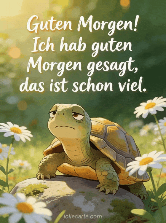 Starte mit diesen kostenlosen lustigen Guten Morgen GIFs mit einer Schildkröte die kaum Guten Morgen sagt in den Tag. Schau auch mal bei lustiges Guten Morgen Bild oder kostenloses lustiges Guten Morgen GIF vorbei.