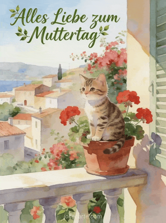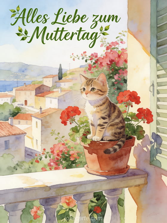 Feiern Sie Mama mit dieser fröhlichen kostenlosen Grußkarte. Eine charmante Illustration zeigt eine Tigerkatze in einem Topf mit roten Geranien auf einem sonnigen Balkon mit Blick auf ein mediterranes Dorf, mit Bougainvillea im Hintergrund. Entdecken Sie auch eine Muttertagskarte mit Fotos, eine Muttertagskarte mit Blumen oder eine Muttertagskarte.