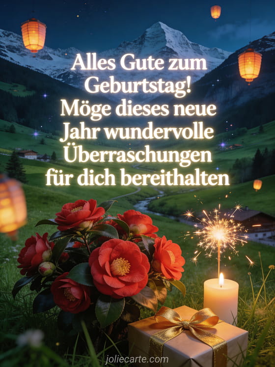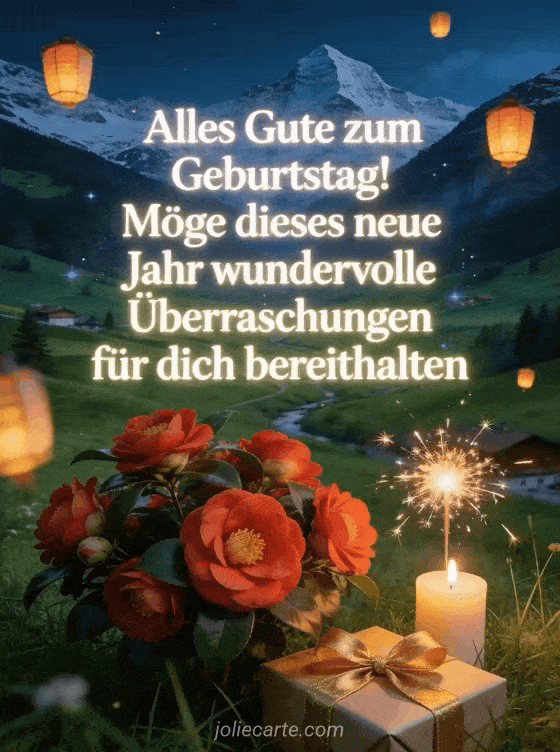 Senden Sie einen Geburtstagswunsch in der Hoffnung, dass das neue Jahr wundervolle Überraschungen bereithält. Entdecken Sie auch eine originelle Geburtstagskarte genieße jeden Moment, eine originelle virtuelle Geburtstagskarte oder eine originelle Geburtstagskarte.